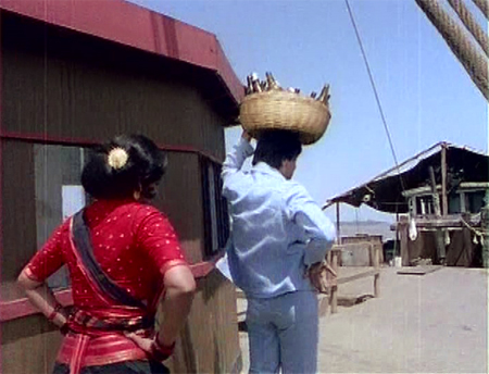 One of his very first passengers is none other than his (as yet unknown) nephew Sunder. I laugh and laugh when Shankar instructs Sunder to sit in the middle of the seat to balance out the weight in the car (I was once the only passenger on a commuter plane, and was told to sit in the back because “we need the weight back there”). They argue about directions and Shankar asks Sunder if he’s come to Bombay to be an actor. But when Shankar discovers that Sunder’s destination is Teja’s house (where he has an appointment for the promised job) he boots him out of the cab, refusing to drive down “Teja Marg.”