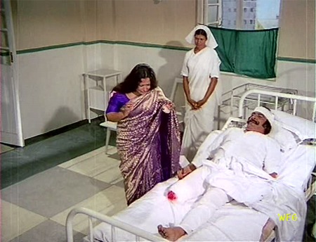 Dutifully, Sita jumps, leaving her brocaded shawl behind for Laxmidas to scoop up. What he doesn’t notice is that a Muslim man, praying nearby, sees Sita go in and jumps in after to save her. Laxmidas takes the shawl home and sorrowfully informs Teja that he is now a widower. But at a nearby hospital, Sita’s rescuer Khan (Anwar Hussain=pyaar, pyaar, pyaar) asks how she is and is told that she is fine—and pregnant! Sita, when she comes to see Khan, is self-pitying until he snaps her out of it by dramatically revealing the sacrifice that he has made in saving her life.