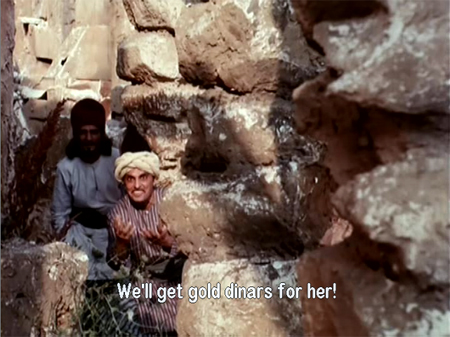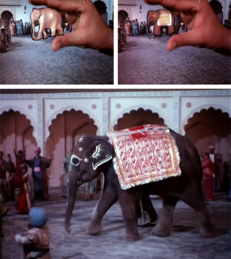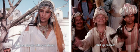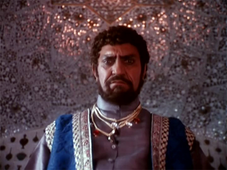 Their previous five sons have been murdered by Queen Malika’s midwife on the orders of the evil Vizier, who wastes no time in offing his own people when they displease him too. But the magicians’ star has done its work well, and the little boy survives. The Sultan throws a lavish celebration and is pleased when his dear friend from the neighboring kingdom of Hind arrives. Amir Khan (Saeed Jaffrey) is a magician himself and presents the baby with the aforementioned elephant charm: