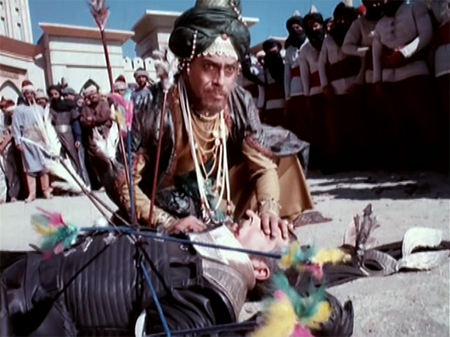 Shah Rukh’s new ploy: kidnap Malika and hold her captive in the town square, forcing Ajooba to come and rescue her. Clever Ali substitutes the Vizier’s brother Ansari for himself; the Vizier’s soldiers shoot him full of arrows as he rides into the Square.