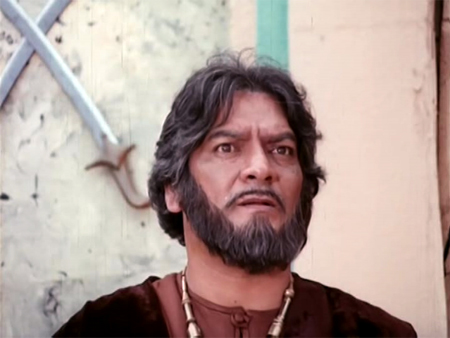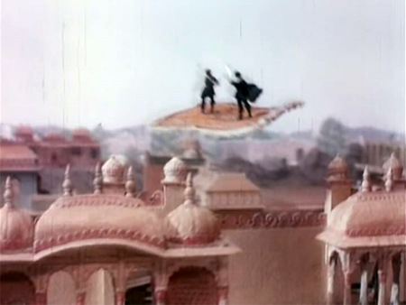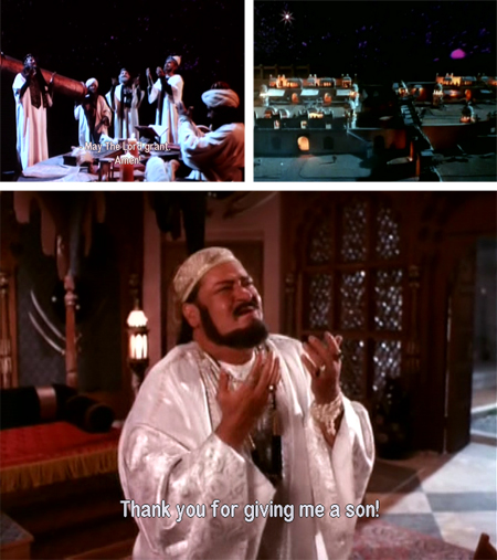Amir Khan’s plan to return home to his own pregnant wife in Hind goes terribly wrong when he is caught up in the Vizier’s plot to overthrow and kill the Sultan and his family. The Vizier imprisons him after taking his precious magical necklace (it keeps anyone who wears it from harm) and then sets his loyal soldiers onto the Sultan. The Sultan (being Shammi) has seen this coming and manages to flee with his wife and tiny son in a boat, where they are set upon by the Vizier and his brother-in-law Shah Rukh (Dalip Tahil) from a flying carpet. Sadly that scene is too dark to capture in a screenshot, but the boat is burned up and the Sultan, Malika and the baby all presumed drowned.