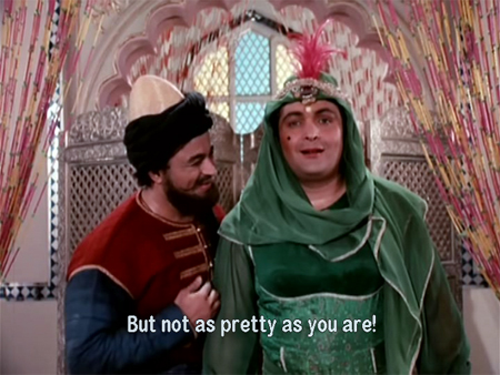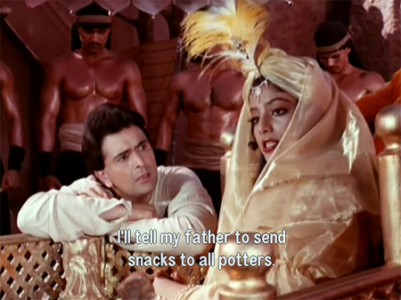 Ali/Ajooba’s best friend (who knows of his double identity) is a cheerful flirt named Hassan (Rishi Kapoor). It’s hard to blame Hassan for his philandering ways, since the entire female population of Bahrestan are dressed in belly-dancer outfits. But his roving eye finally comes to rest on the Vizier-Sultan’s daughter Henna (Sonam). He audaciously introduces himself to her and tells her he is a poor potter who can barely get two square meals a day. She is spoiled and clueless, a princess with no understanding of the peasant class: “If they don’t have bread, let them eat cake!”