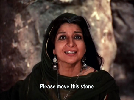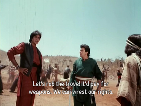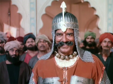 The subtitles are terrible (although occasionally funny too, as usual). For instance, protagonist Ajooba’s catch-phrase is the well-known Urdu couplet by author Agha Hashr Kashmiri (Mehboob Khan famously used it as part of his production company logo): “Muddayi lakh bura chahe to kya hota hai, wohi hota hai jo manzoor khuda hota hai.” It is badly subtitled here as “No ills can evil-doers perpetrate, all that happens is willed by the Lord.” This makes no sense as we watch the bad guys decimating the citizenry left and right, but keeping in mind the much more accurate (and blissfully short) translation “Man proposes, God disposes” it works a lot better.