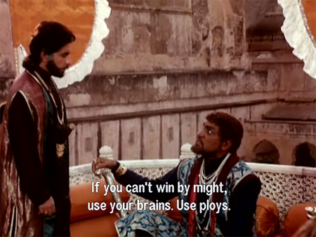 Besides the poor subtitles and heavy-handed breathy 1990s-style dubbing, the only sour chord for me really (dare I say it?) is Amrish Puri’s one-note performance as the Vizier and his own stupid catch-phrase “Shaitan zindabad!” He gets on my last good nerve very quickly and I long for Ajit or Madan Puri instead. I wonder if Mr (A) Puri ever got fed up with playing the same uni-dimensional character in every film he was ever in? I’ll bet he did. In any case it’s unfair that the wicked Vizier gets to live and work (is villainy a job?) in my favorite room of all time.
