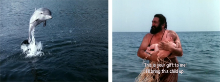 Ajooba takes Malika home and disappears, reappearing a short time later as Ali. They bond and Ali takes her to meet his “mother”—the dolphin. I can think of nothing except William Faulkner’s classic novel “As I Lay Dying” and the 5-word chapter within: “My mother is a fish.” Ali even says “Ma yeh, yeh machhli hai.”