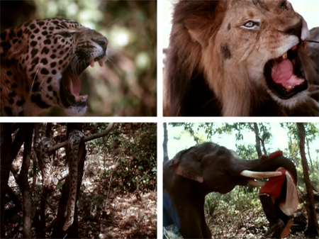 Amir Khan is blamed by the Vizier for the death of the Sultan and his family, and the Vizier is declared the new Sultan. In his dark isolated cell, Amir watches through a magic ring as Malika’s brother Anwar (Tinnu Anand) asks the Maharaja of Hind (Dara Singh!) to punish Amir’s wife Zarina (Sushma Seth) for Amir’s crimes. Dara sensibly refuses, and Zarina gives birth to a daughter after she is saved from Anwar’s thugs by a lion, a leopard, a python and two elephants. In grand masala tradition, this film is chock-full of animals equipped with intelligence and a keen moral compass, who rise to the occasion when the humans fail to come up to scratch: