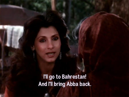 Meanwhile, poor Amir Khan is whiling away his time in the dungeon by sending birds with messages to Hind in the hopes of finding his lost wife and daughter. One clever bird tracks them down and fortunately daughter Rukhsana (all grown up into Dimple Kapadia) understands its billing and cooing (again, why quibble with something so fun?).