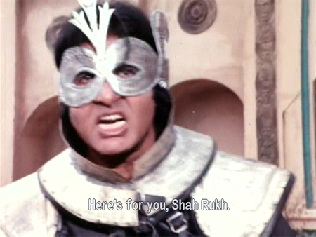 He meets up with his real mother Malika, now a blind beggar still clutching the little stone elephant in her hand, when she convinces the townspeople to refuse a bribe offered by Shah Rukh in return for information on Ajooba. When Shah Rukh whips her in retaliation Ajooba shows up and turns the tables. Malika eventually manages to stop him, but not until he’s given Shah Rukh quite a solid whipping as the crowd counts along with glee (this subtitle and context also made me giggle, for obvious reasons):