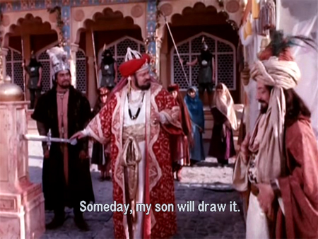 along with a magic sword for the Sultan which can cut through rock. The Sultan promptly tests this by shoving it into a marble column. Amir Khan watches in amusement as the Vizier tries to draw it back out without success, and eventually tells him that the sword can only be withdrawn by someone of royal blood. The Sultan is pleased and decides to leave it there for now.