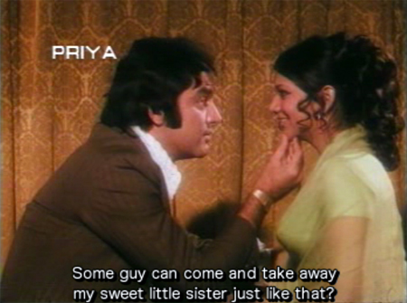What more can I really say? Just see it, it’s fun as long as you have recourse to the FF button on occasion. If you need subtitles (you will need to get the Priya VCD), I will happily email them to you if you leave me a comment (put your email address in the proper field and nobody will be able to see it but me). And bahut bahut shukriya to Raja for his efforts in putting them together for those of us who need them. Thank you, my friend—sometimes it isn’t just the “classics” which deserve translation!
