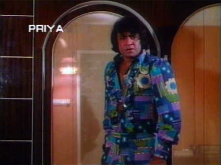 Oh my gosh, I want to watch this – but I wouldn’t write it up because all I could do is post exactly the same pictures you did! :) Ranjeet’s fashion parade is *110 percent* amazing. It’s like examples of the logical extensions of all the arguments created by other costumes of the era, e.g. if a neckerchief looks so awesome with a suit or tunic or psychedellic button-down shirt, then WHY NOT with belted swim trunks? And Rekha’s overalls? WOW.