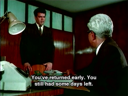 I don’t even mind that their romancing takes up a good part of the first hour of the film, with no spy hi-jinks to be seen anywhere! But eventually, Rajesh is called away from his beloved by the demanding Dr. Sharma—except that he denies having called Rajesh at all and is surprised to see him.