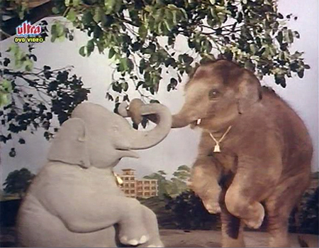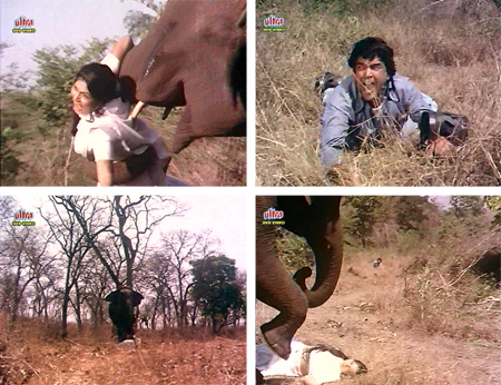 I will say this: it was fun to watch the Mama Elephant twirl Nirupa around with her trunk before throwing her to the ground and stomping on her (even if Nirupa in this case did not wholly deserve it). And it was funny to watch Baby Elephant push Dharmendra around a bit (he did deserve it, and more). And *SPOILER* the elephant reunion is very happy and sweet! *END SPOILER*