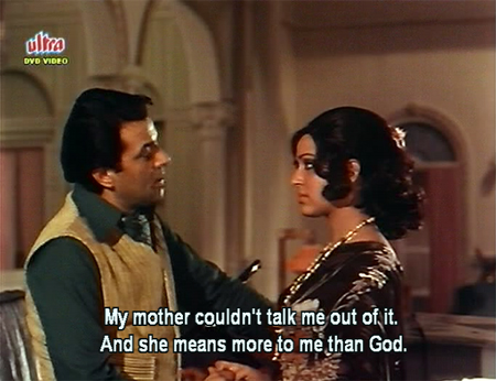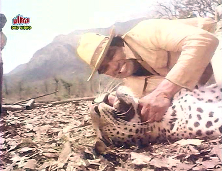 His mother (Nirupa Roy) disapproves of his hobby, especially when he separates helpless baby animals from their mothers, making her for once someone with whom I fully agree; but Vijay doesn’t believe that animals have the same feelings as humans—although there is plenty of evidence to the contrary if he would just pay attention. I detest Vijay intensely from the get-go, and not even the charm and good looks of Dharmendra can redeem him. There is only so much running-in-abject-fear that I can watch these poor animals do (and I am pretty sure they aren’t acting), so the FF button is quickly my best friend.