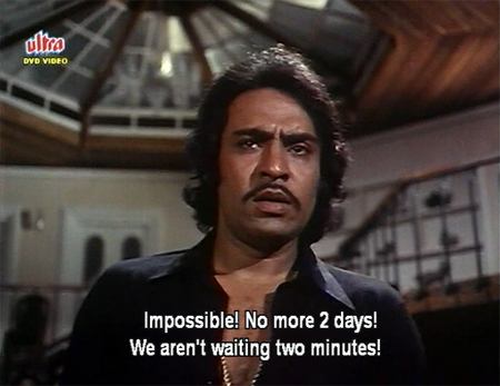 I don’t know if this film was made for children or not, given the number of cute baby animals etc. in it, but it is chock full of dumb messages like “Go ahead and pick up a wild baby lion cub even if its protective mother is lurking nearby!” and “If you are chased by a tiger, climb a tree because it can’t get you then!” all of which are followed by “…oh wait…ohhhhh.” Attention to detail is such that leopards are misidentified as cheetahs and the mama lioness has a mane. It is painfully stupid, over-long, harrowing to watch if you’re an animal sympathizer, and Nirupa Roy (as Dharam’s Maa) is the only sensible character in the movie!