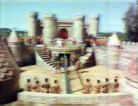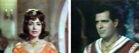 So Roopa is Vijay’s real brother, and Ajay is actually Balwant’s son! Balwant frees Ajay, who rides home and tells Bhavani that Roopa is her long-lost youngest son. The Rajkumar overhears this conversation and sends his soldiers to arrest Roopa and Vijay, who are in the middle of their swordfight, with Kamini trying vainly to stop them. He also tosses Bhavani, Bindia and Ajay into his dungeon, where he has already incarcerated his own father the Maharajah and taken over the kingdom (he celebrates the occasion with Bela and Madhumati again!):