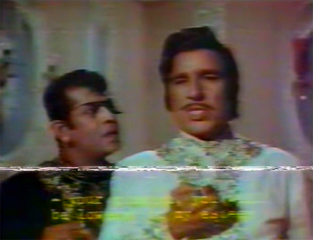 Sadly this isn’t a film anymore, but the last gasping remnants of one: a collection of random scenes (or partial scenes) strung together incoherently with big gaping wounds of missing content (and sometimes, sound). There are barely two seconds of footage together anywhere not punctuated by a skip or a jerk. That it still manages to be kind of fun to watch is a testament to…something, although I am not sure I can pinpoint what that Something is. It might just simply be Dara. Or Ajit, Randhawa, Nishi, Helen, Madan Puri, Bela Bose, Madhumati and some perfectly scintillating songs and dancing.
