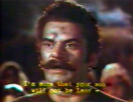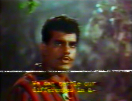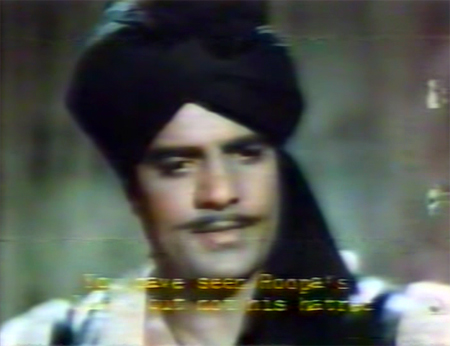 Through a lengthy flashback from which the sound is missing but for which there suddenly and mysteriously are fairly readable subtitles, we learn that Man Singh Thakur (Tiwari), was a respected and extremely brave chieftain in this very area years before. Everyone in the place seems to have been as quarrelsome then as they are now, and Man Singh defeated a neighboring clan called the Chauhans. Roopa’s father Balwant saved Man Singh’s life during the battle, and as thanks Man Singh had given Balwant Singh a sword for his then two-year-old son.