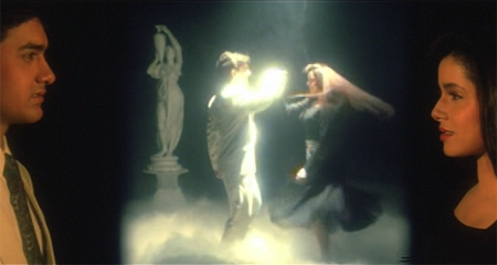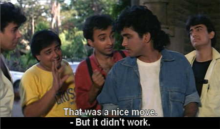 Raj (Aamir Khan) is the son of wealthy Mahindra Behl (Kiran Kumar). He is a happy-go-lucky kind of guy with three close friends at school (Deepak Tijori, Rakesh Bedi and Raju Shrestha—my little Master Raju, all grown up!).