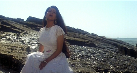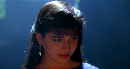 When I began watching Hindi films in 2002 or so, many of the first ones I saw were from the 1990s. And yet still—I persisted! I was charmed! I guess it was all so shiny and new that I didn’t know or care how hackneyed or obnoxious the plots were and the OTT use of wind machines and light filters merely fascinated me. “Look! her hair is blowing wildly inside her house!” “Oooh! A thousand points of light!” etc. Plus the people (Aamir, Shahrukh, Kajol, Rani) were so very good-looking and the girls had such glossy, glossy long hair. But none of them were a patch on Neelam in that department.