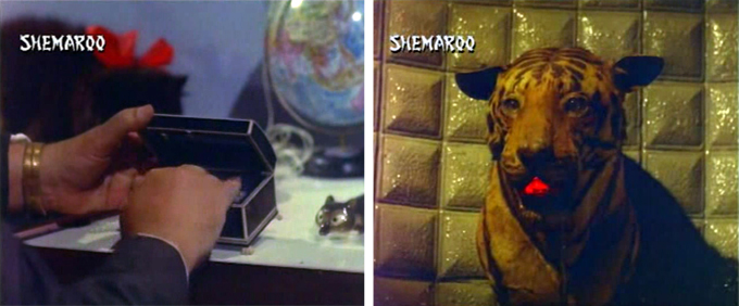 We of course never get to see Boss’s face (until the end) although I will say that I early on knew who he was from the distinctive voice. Desk Lair accessories also include two light bulbs, red and green, which flash to indicate stuff; and a little china fox (?) figurine which, when pushed, summons the beefy deaf-mute wrestler guarding the room outside by causing another red bulb to flash inside a stuffed tiger’s mouth.