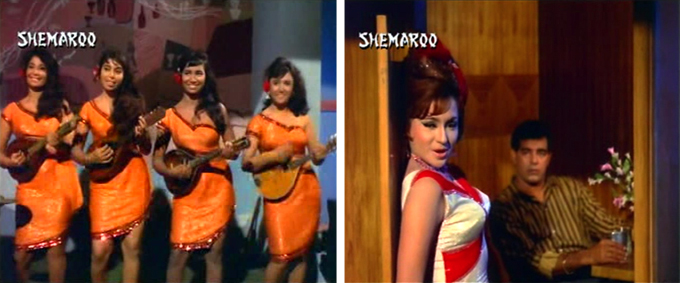 Trouble—usually the arrival of the police—is flagged by the man behind the reception desk (Keshav Rana) at Hotel Mogambo, the front for the Golden Gang’s criminal activities. Where there’s a Hotel Mogambo there must also be a nightclub with a cabaret, and we are immediately treated to a lovely Helen song (“Mujhko Deewana”) where she is backed up by four girls strumming ukeleles.