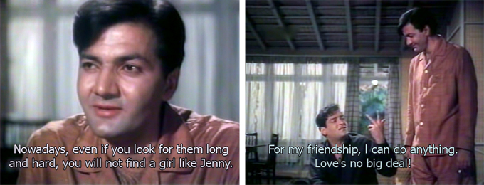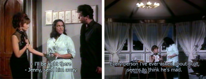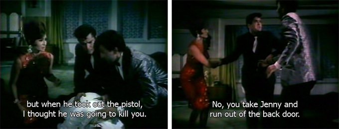 Up to this point the only clue that Shyam might not be the ideal best friend is that he is Prem Chopra, but now Sujit fails to see Giant Warning Sign Number 1: Shyam is all too happy to flee with Jenny and leave Sujit there to be arrested for the murder of Max in his stead.