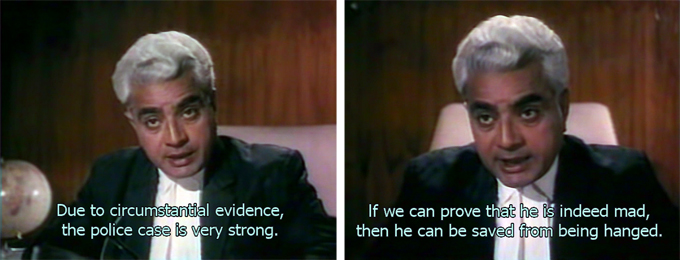 All agree on this plan of action, and in court Sujit pretends to be crazy while Mehta calls witnesses to attest to his madness. First up is the director of the orphanage where Sujit was raised, who tells the sad story of Sujit losing his mother to cancer at age 6, and then being violently rejected by his father who went mad as a result of her death. (He describes a troubled and sad little boy, not a mad one, but nobody sees the difference.) Then Shyam testifies against him, followed by a reluctant Jenny. Both Shyam and Mehta bring up the self-defense argument but only as an aside, with the insanity plea remaining the focus.