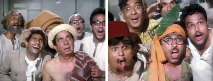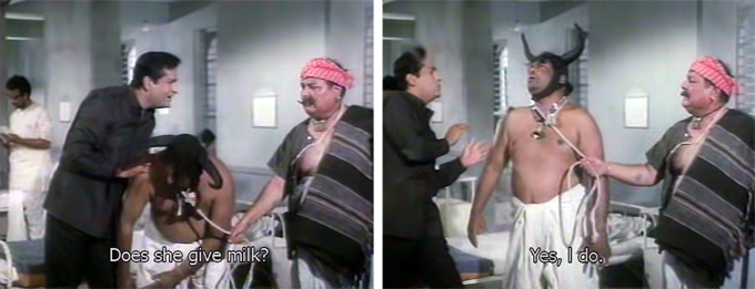 My own favorite crazies are Gangu Teli (Ram Avtar) and his buffalo (Asit Sen), who lead us into a fabulous song called “Mhaari Bhais Ko Danda.”