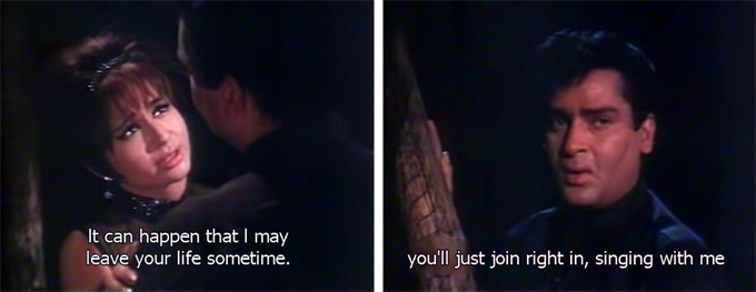 I believe that I’ve read someplace that this is Shammi’s favorite song from all of his films, and it is just lovely, especially the lyrics by Hasrat Jaipuri (did I mention that they are subtitled! Ha!).
