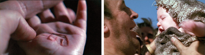 The baby’s little hand is branded with the symbol of Ar, as Maax had instructed, and the witch raises a knife to kill him. But a brave if foolhardy man has stumbled across the horrific scene and he intervenes, managing to kill the witch (or at least make her go away). He takes the baby home to his small farming village and names him Dar.