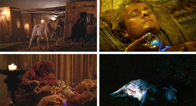 Before being escorted out, Maax informs Zed that it is his child who will be sacrificed that night, but for some reason Zed spares his life and lets him go. (This is not a movie built on logic.) Later that night, as Zed and his Queen sleep, one of the witches creeps in with a cow (actually, it’s a bull to begin with but I don’t want to quibble over petty continuity issues), paralyzes them with a bright blue liquid, and transfers the baby from the Queen’s belly to the cow’s, killing the Queen. She takes the cow away into the forest and then cuts the baby out of its belly, which seems needlessly complicated to me and why drag the cow bull cow into it at all? Poor thing.