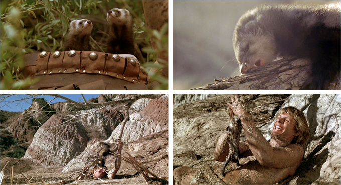 Honestly it’s probably the animals that make me love it so much. Although I couldn’t see why they had to dye the poor tiger black. Marc Singer said that the tiger’s trainer told him to remember that Kipling (the tiger’s real name) “was a cat, and Singer was a mouse” and that working with it “was a religious experience every day”. And he loved the ferrets, said they were just so much fun and very well trained.