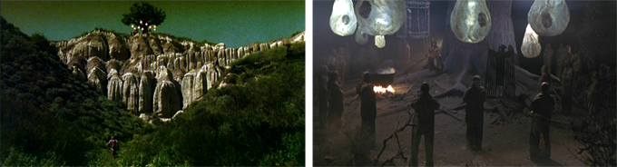She refuses to go with Dar, saying that her family is also held captive by the priests and runs off. I wonder if it’s maybe because he’s forced a kiss on her and been quite grabby, but she doesn’t seem that smart. Curious and still smitten, he decides to follow her trail with his animal pals. Next up: a verrrry creepy bunch of skeletal people-eating pod creatures under a tree hung with pulsating Chinese lantern-type things.