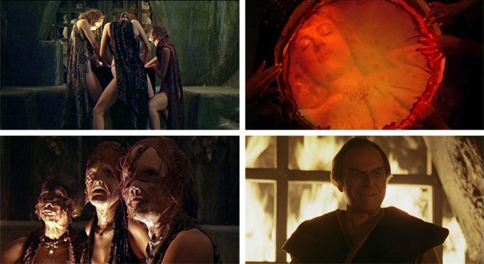 We open with three scantily-clad witches with scary heads but the bodies of supermodels. This would normally cause me to roll my eyes, but I know by now that there is plenty of equal-opportunity man-candy to come, so I don’t really mind. The “ladies” are peering into a magic cauldron, through which they are watching a sleeping woman. They are minions of High Priest Maax (because Max is too ordinary) (Rip Torn, who has gone off the rails a bit since this was made) and they have unfortunate news for him.