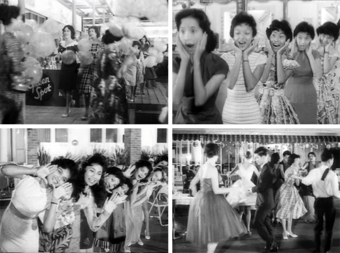 Shyam finally finds the map Ramesh had hidden in my the VAT 69 Musical Cigarette Case after listening to the recording of their call. I should mention here that the editing in this—probably at the vcd/dvd manufacturing phase—is awful. Scenes begin abruptly with people who weren’t around a minute ago, and the cuts between scenes are choppy at best. Anyway, Shyam’s romancing of Lata proceeds apace, buoyed up by streets full of women of all nationalities wearing shirtwaist dresses and cheongsams, waving balloons and making faces and dancing the cha-cha-cha.
