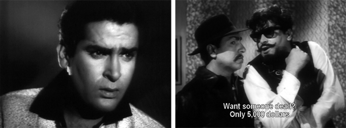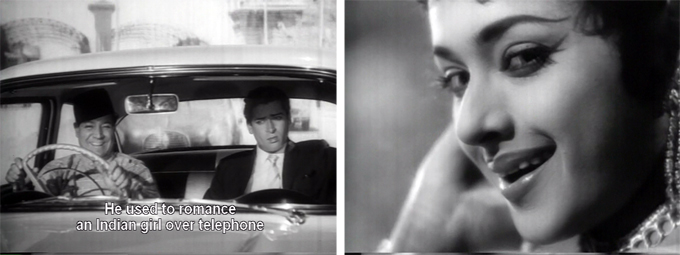 I have seen this, but too long back to remember much more than that it did get distinctly tedious for me – which is saying a lot for a Shammi Kapoor movie! What amused me was that a lot of the stuff in this film is either recycled or got recycled later. For instance: ‘Miss Chin Chin Choo’ is obviously a nod to Helen’s brief but awesome role in Howrah Bridge; that cigarette case with the ‘exploding cigarettes’ is something I have seen in a later – colour – film, though right now I can’t remember which one. And Shammi Kapoor – in a number of screen shots from the post is wearing the T-shirt (that light-coloured one with the collar and dark shallow V-design) which he wore in the climax of Professor.