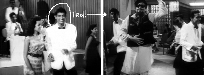 Oh, my, was Padmini a sight there! And the music was so much fun too… And that whole setup with the horn player and drummer was classic – I think this set a standard of some kind (though I do get the impression there was some older South Indian stereotype at work there too :) )… There was a Sridevi dance in a movie made 23 years later that reminded me at the beginning of this dance (a lot) – which I could illustrate, but probably, I am already diverting attention too much away from your beloved Shammi :) …