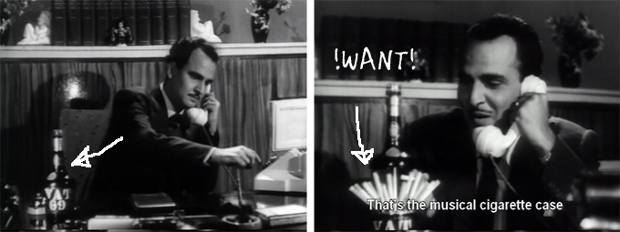 This is a stellar gadget scene: a reel-to-reel recorder automatically tapes the call, and Ramesh stashes the map inside a musical cigarette case masquerading as a bottle of VAT 69 when his conversation is interrupted by two men lurking outside. Shyam hears the tinkling of the musical case as Ramesh shuts it quickly into a desk drawer. I simply adore the explosion of cigarettes when the thing is opened, and the completely incongruous tinkling ballerina music which issues forth.