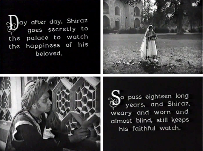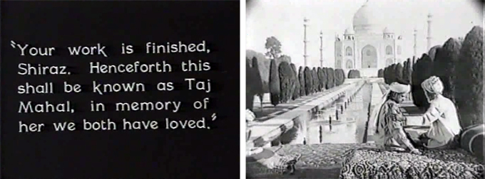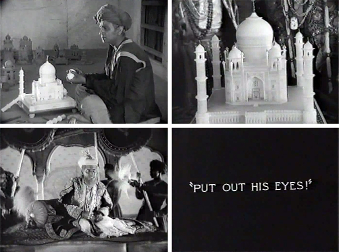 (I love that the intertitle is in all caps for that one.) Luckily the guy wielding the red-hot pokers realizes that Shiraz is already blind, and informs the Emperor—who finally recognizes him as his late wife’s “brother”. Whew! Shiraz moves into the palace and works with the Emperor’s builders to ensure that the monument is built, and then they all live happily ever after (at least until the Emperor’s son overthrows and imprisons him, but they don’t show that part).