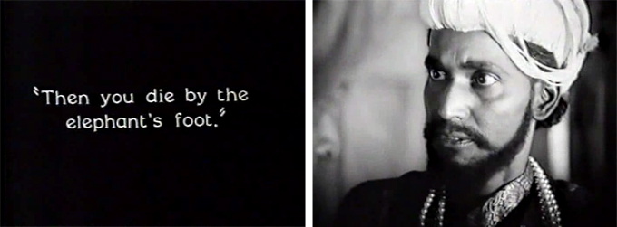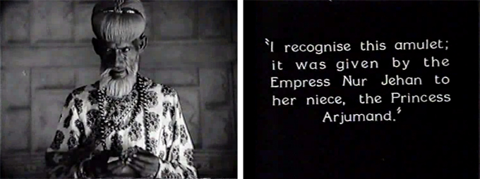 Shiraz’s execution is stopped in the nick of time as the elephant foot hovers over his face, and he and Selima are brought to Prince Khurram. So is Dalia, and she is banished for her sins. The Prince asks Selima whether she loves Shiraz and she says that she loves him as she always has like a brother (poor Shiraz!) but that she loves the Prince. Gracious in defeat, Shiraz hands her gold amulet over to the Prince and the palace historian is called to examine it.