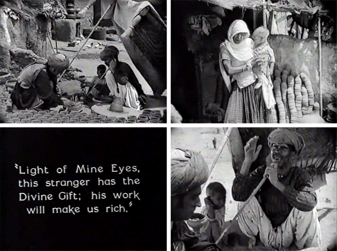 Hasan names her Selima, and she grows up with Shiraz. As they reach adulthood, his affection for her turns to love. He is now working with his father as a potter, and makes beautiful birds and figurines for her as well. But alas! Selima (Enakshi Rama Rau) is seen one day by some slave-raiders, who knock Shiraz (Himansu Rai) unconscious as he tries to fight them off, and kidnap her. He awakens and realizes that in the melee her “protective” gold amulet has ended up in his hand instead.