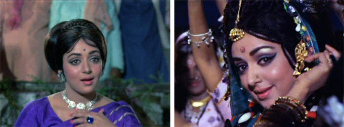The town of Ramgadh is having their annual fair, and everyone is attending in their finest jewelry and with money in their pockets to spend. Ajit sends his gang out to loot them, led by Sarju (Ajit’s gunshot wound is still healing). The girl who gave Ranjeet a ride in her jeep is sitting on the sidelines, obviously one of the more elite members of society, until the dancers cajole her into joining them for “Aiso Paapi Sawan Aayo”.