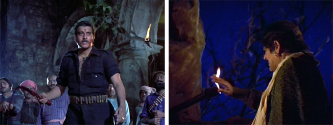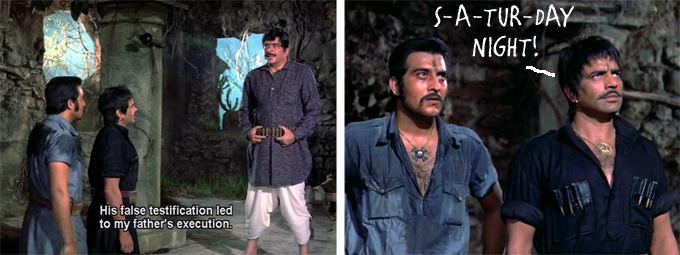 Back in their ruins, Sarju uses the execution of his own brother Mahavir as leverage to force Ajit into letting him whip Ranjeet for insubordination (rules is rules!). Unable to watch, Ajit slips out and—apparently not content with incapacitation in one arm only—uses the hand of the other to put out a lighted torch.