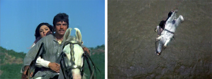 But things will never be the same again. Sarju is now fixated on Asha, determined to have her at any cost, and Ranjeet overhears him plotting to kidnap her. He sweeps in to save her in the nick of time and they escape in a thrilling horseback ride which culminates in a wooden horse carrying strapped-on dummies being tossed into a river.