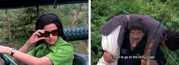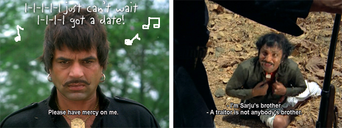 (The message that Ranjeet is a “nice” man and different from normal dacoits has by now been pounded into our skulls over and over again.) Ranjeet beats the crap out of Sarju, which is totally against the dacoit code as well (“Thou shalt not make thy leader bleed from a head wound!”). The girl—whose name is Asha—thanks Ranjeet grudgingly and then launches into a lecture on the error of his ways.