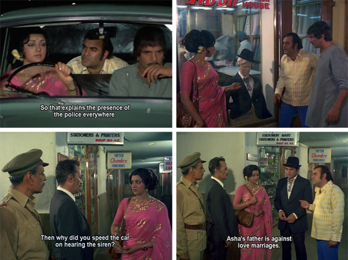 When Asha goes to meet Ranjeet in the evening, Varma has her followed (a smart policeman! Wah!). I am thrilled when they flee into a shopping center: I smell makeover! About time too!