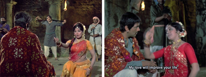 Ranjeet submits to Ajit’s command, but is not happy that Sarju’s character and deeds are not called into question. But brothers who love each other so deeply can’t remain angry for long, and they are soon reconciled. To celebrate, Ajit hires a dancer (Rani) to perform for his men; Ranjeet realizes that he is picturing Asha dancing instead. It must be love!