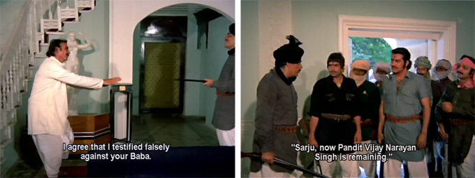 He sends off Sarju to threaten Vijay Narayan Singh, who insults Sarju (and Ajit, by proxy). Sarju reports this indignity back to Ajit and Ranjeet, and Ajit launches intensely into their backstory, obviously not for the first time.