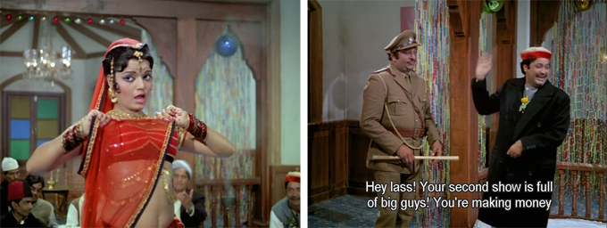 Banke Lal (Deven Verma), the manservant, has been out all evening and thus becomes the first suspect. He also happens to be wearing a dark overcoat when he’s found at the local kotha (an excellent excuse for a song and dance: “Jubana Se Chunariya”—anyone recognize the dancer?).